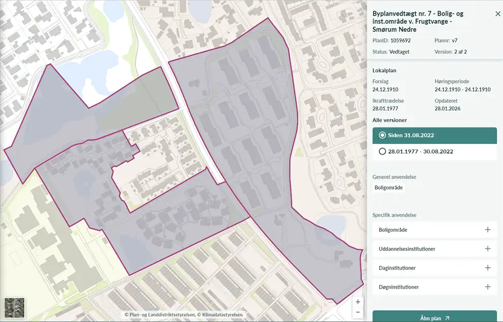 For nogle lokalplaner kan du se tidligere versioner af planen. Det er især relevant, hvis lokalplanen er blevet ændret eller opdateret efter en ny vedtagelse i kommunalbestyrelsen. Ændringer kan for eksempel skyldes, at dele af lokalplanen er blevet aflyst, eller at bestemmelserne er blevet ændret.