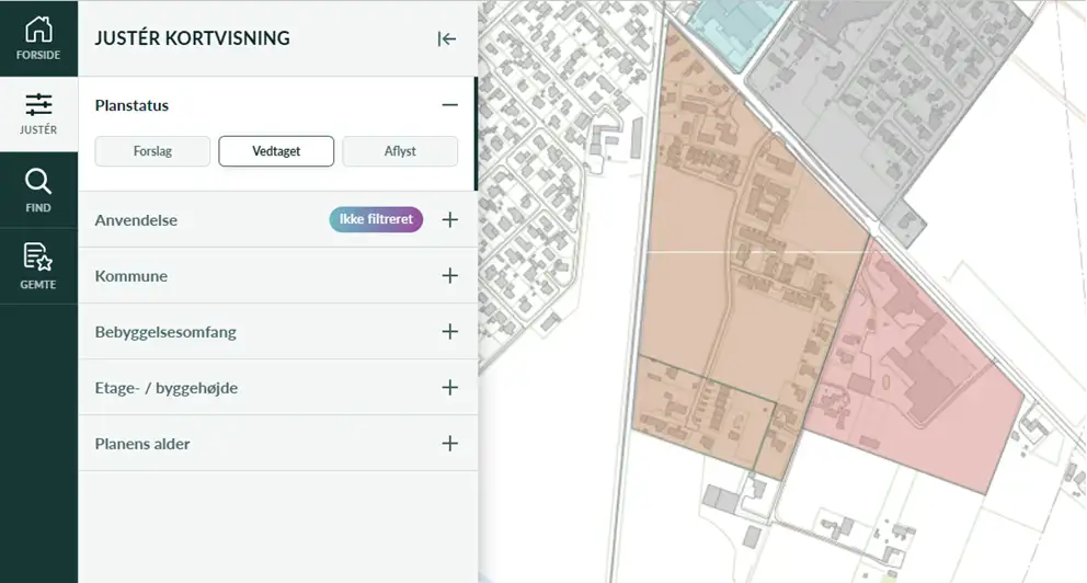 I toppen af venstreside ses en menulinjen, hvor feltet ”Justér” per automatik er valgt. Herunder kan der vælges fem underkategorier (Planstatus, Anvendelse, Kommune, Bebyggelsesomfang, Etage- / byggehøjde og Planens alder). Som default er alle typer lokalplaner med status vedtaget slået til.