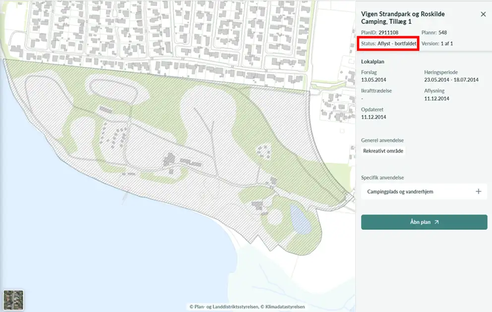 Du kan også se planer med status "Aflyst – tilbagetrukket". Denne status bruges, hvis Planklagenævnet har truffet afgørelse om at underkende en plan. Planen kan derfor tidligere have fremgået som vedtaget, men er efterfølgende blevet erklæret ugyldig af Planklagenævnet. Planen er dermed ikke gældende og skal betragtes som om, den aldrig har været gældende.