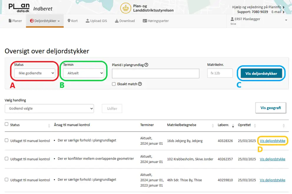 En oversigt over samtlige af en kommunes deljordstykker findes ved at klikke på fanen ”Deljordstykker” i topmenuen som vist på Figur 3, A. En rød prik i topmenuen ved ”Deljordstykker” indikerer at deljordstykker er udtaget til manuel kontrol i kommunen. Oversigten over deljordstykker er sorteret efter deljordstykkernes oprettelsesdato.