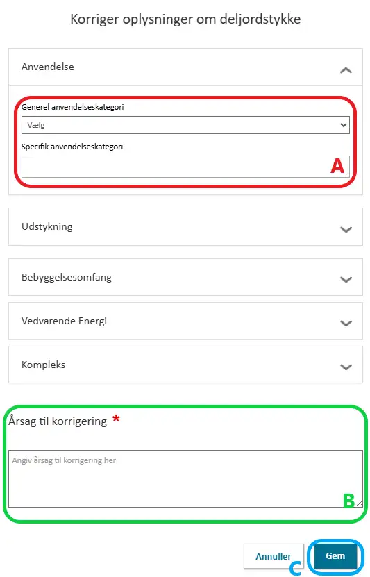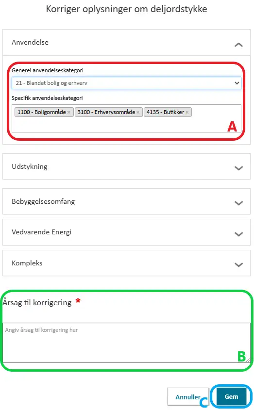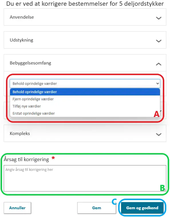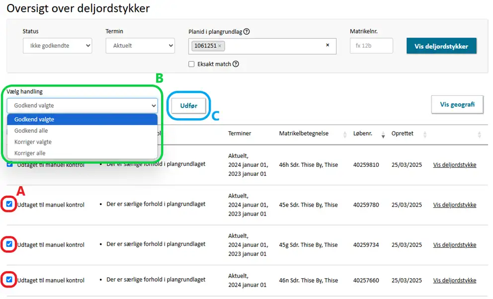 Såfremt de fremsøgte deljordstykker er filtreret efter ikke-godkendte deljordstykker, er det muligt at foretage en ”Korrigering” eller ”Godkendelse” (Afsnit 5.1) af de på kortet valgte deljordstykker, Figur 7, A.