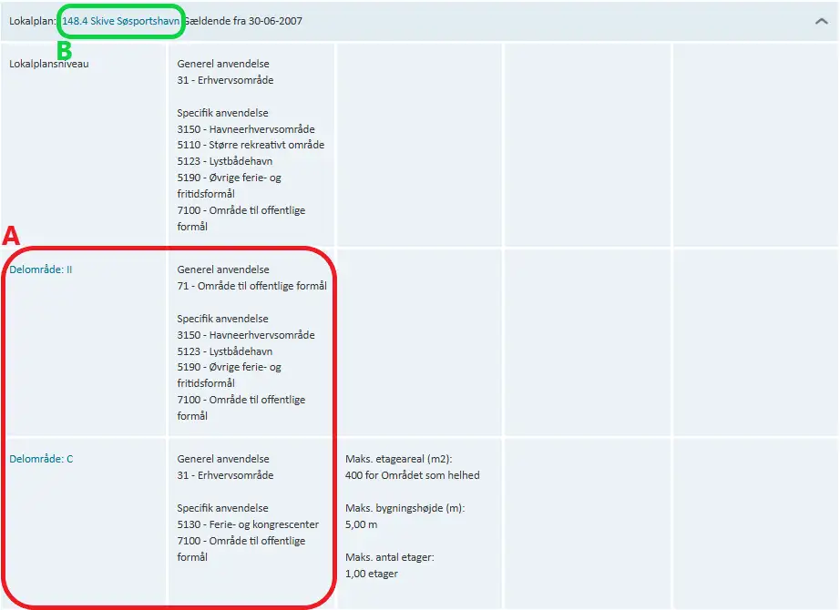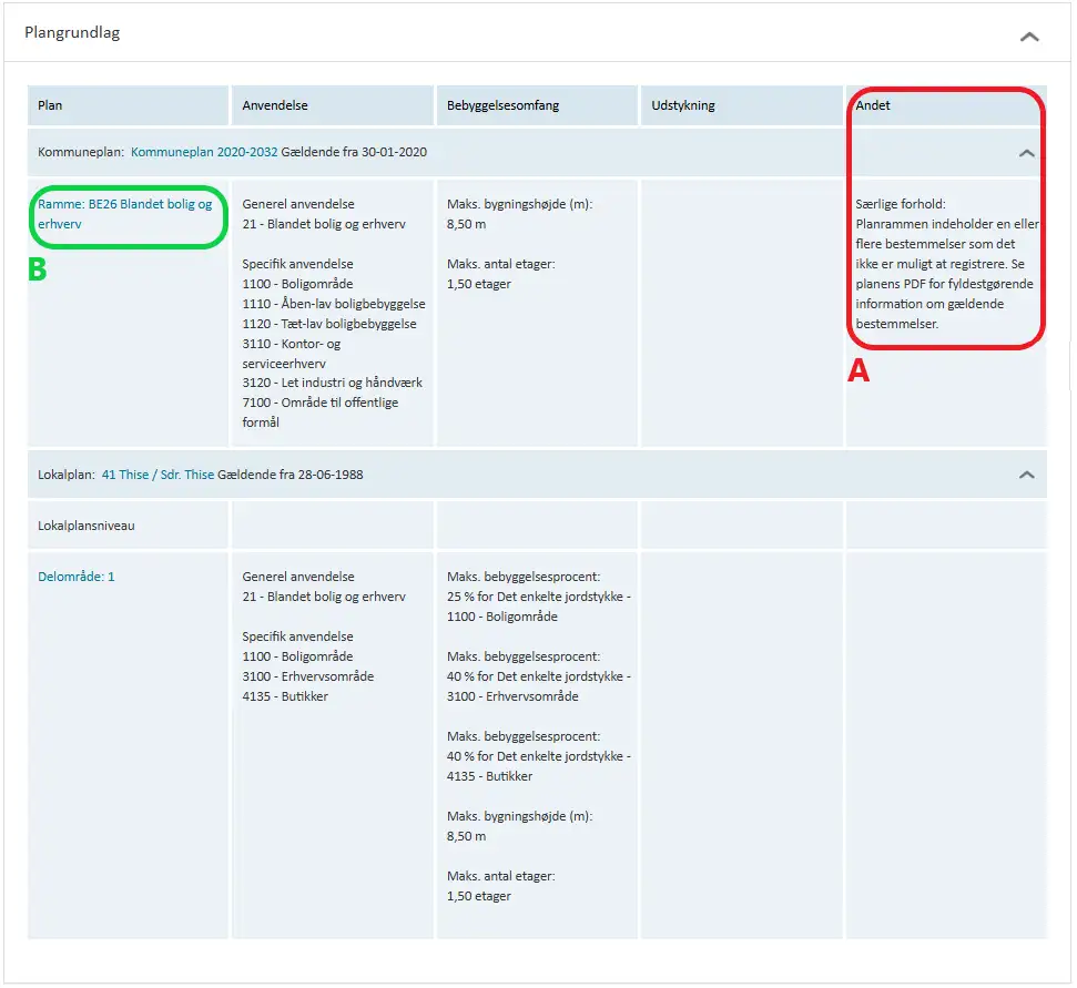 Det er muligt at tilgå et valgt deljordstykke ved at klikke ”Deljordstykke”, Figur 7, B. Ved at klikke ”Vis alle deljordstykker med samme plangrundlag” bliver man ført tilbage til oversigtssiden med deljordstykker, som vil være filtreret til kun at vise deljordstykker med nøjagtigt de samme planid i plangrundlaget – hverken flere eller færre.